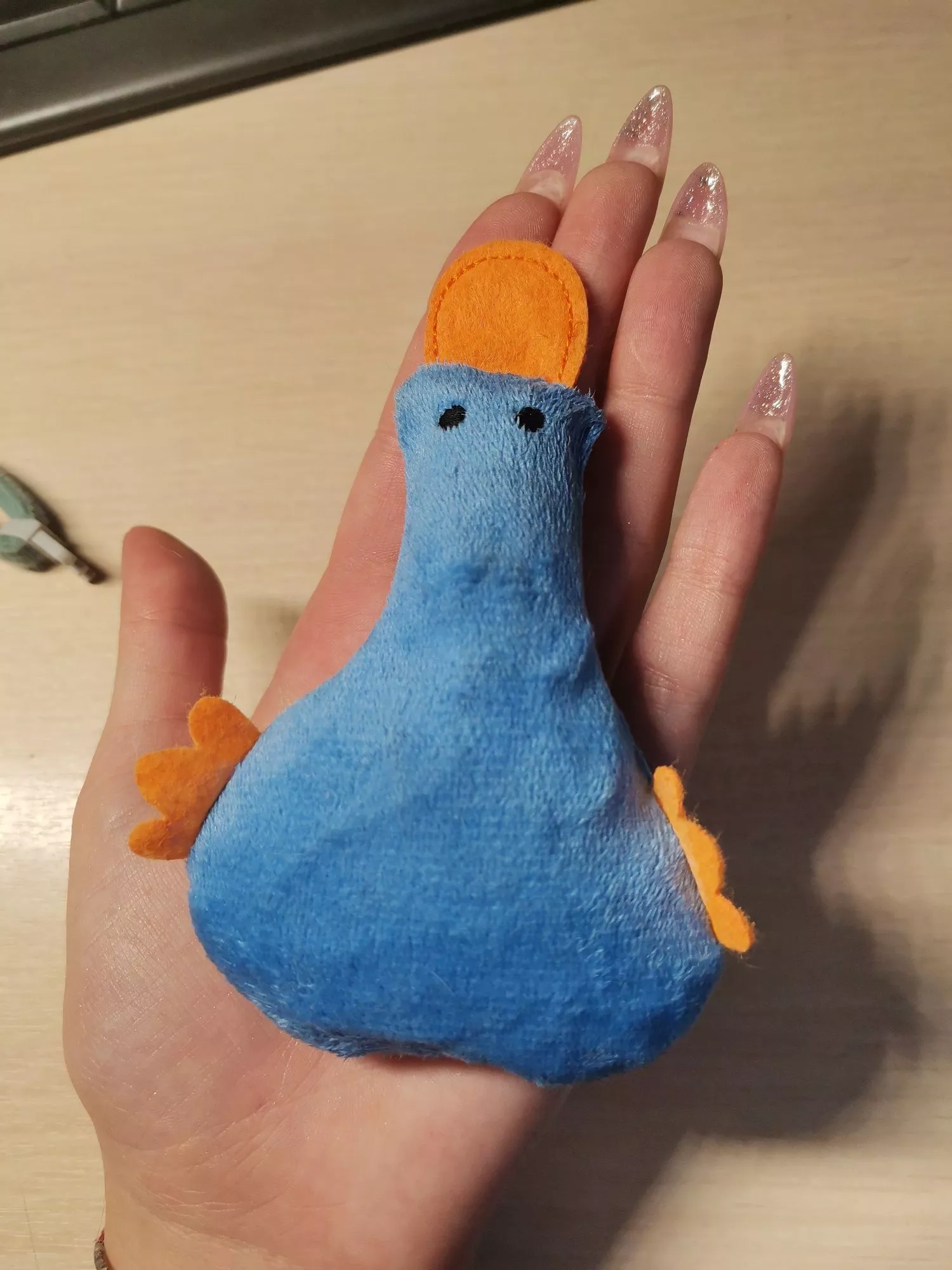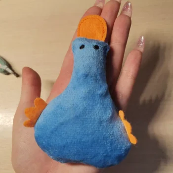 Very cute toy. Small, with a palm, but I needed one. My Chihuahua likes these toys very much. Duck rustles, there is no glue all sewn!! 10/10✨